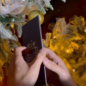 Op de zilveren binnenkant staat een tekst met goede wensen: "Vrolijk Kerstfeest. Ik wens je een seizoen vol vreugde, een seizoen vol vrolijkheid, maar vooral een geweldig jaar!".