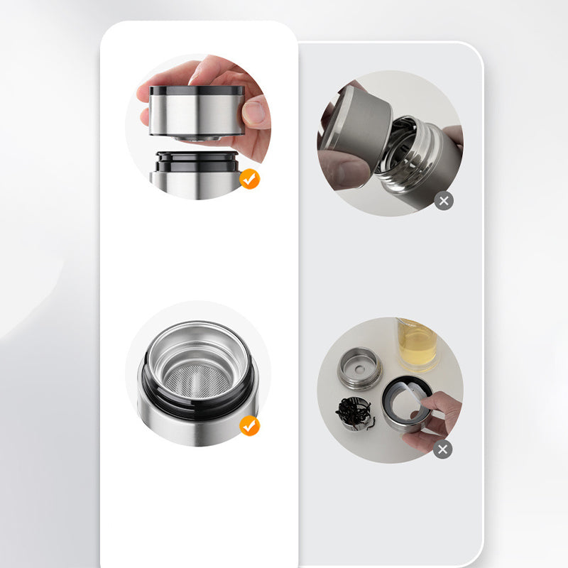360° LEKVRIJ ONTWERP: Dit theekopje is voorzien van meerdere siliconen ringen voor een waterdichte afsluiting, zelfs als je het schuin houdt. Perfect voor gebruik in de auto of tijdens het woon-werkverkeer.