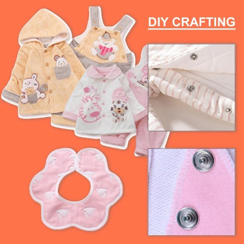 Niet zoals andere plastic drukknopen die gemakkelijk kunnen breken, zijn onze drukknopen gemaakt van roestvrij staal dat helder, duurzaam en roestbestendig is. De handdruktang is gemaakt van ABS van hoge kwaliteit en is veilig voor de babyhuid.