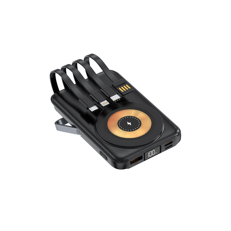 INGEBOUWD MULTIKABELLYSTEEM āĀ Deze powerbank is uitgerust met vier geĆÆntegreerde aansluitingen: Lightning, Type-C, Micro USB en USB-A. Hiermee kunt u meerdere apparaten tegelijk opladen zonder extra kabels. Of u nu licht reist of onderweg meerdere apparaten gebruikt, dit alles-in-ƩƩn ontwerp bespaart ruimte en zorgt voor minder rommel. Neem slechts ƩƩn apparaat en u bent klaar voor elke oplaadsituatie.