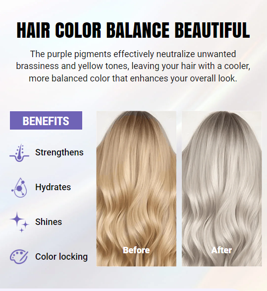 NEUTRALISEERT KOPER- EN GELE TONEN: De paarse pigmenten neutraliseren effectief ongewenste koperkleurige en gele tinten, wat zorgt voor een koelere, beter gebalanceerde haarkleur die je look versterkt.