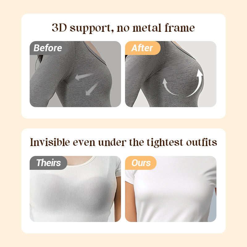 BEVESTIGING ZONDER BEUGELS: Geniet van volledige bewegingsvrijheid zonder in te leveren op ondersteuning. De slimme W-vormige structuur lift en fixeert je buste op natuurlijke wijze, waardoor het ongemakkelijke prikken en graven van traditionele beugels wordt geëlimineerd voor een echt bevrijdende ervaring.